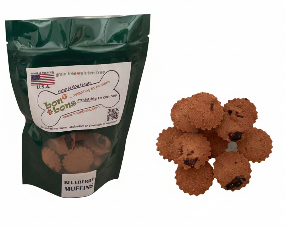 Who doesn't like blueberry muffins? These mini dog muffins are loaded with antioxidants, our homemade peanut butter and applesauce. Grain Free!